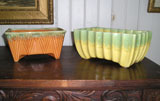 I started buying these planters—they’re marked McCoy, Upco, Brush, Hull, USA-because they fit the period of my house, are colorful (I just found my first orange one!), come in a variety of shapes (I rarely see two the same), and because they were inexpensive.