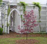 I fell in love with this use of a simple trellis to disguise an undistinguished building or a windowless wall. As the photo shows, it can be striking even before the plants have matured. The small tree is a Japanese maple, but an elderberry would be hardier, and it’s half as expensive. I’m now looking for a place to plant an elderberry.